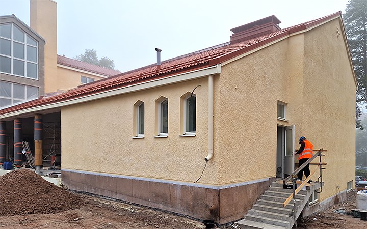 Uuden ja vanhan osan julkisivut on toteutettu eri menetelmillä, jotta pintaan on saatu haluttu kuvio. Julkisivu-urakoitsijana toimii Vakka-Suomen Rappauspalvelu ja työnjohtajana Tiit Teder. Hän kertoo, että uuden osan julkisivut on tehty märkälaastilla hiertämällä, jolloin pintaan on saatu kaunis tekijänsä kädenjälki. Vanha osa on tehty niin ikään märkälaastilla, mutta julkisivu haluttiin näyttävän rouheammalta ja mahdollisimman lähelle alkuperäistä pintaa, jolloin pinta ruiskutettiin suuremmalla raekoolla.